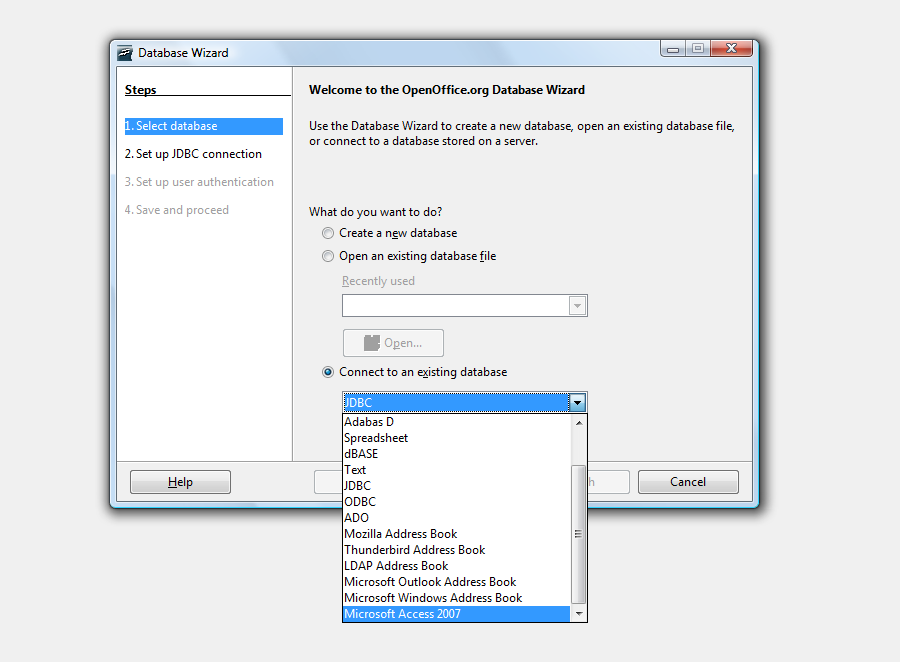 L’équivalent sous OpenOfficeSuite de logiciels de bureautique, développée selon le principe du logiciel libre et concurrente de la suite Microsoft Office. OpenOffice est une suit… d’Access sous Microsoft Office permet de se connecter à une base externe : Access, MySQL, Oracle, etc. Par exemple, pour vous connecter à une base Access, il faut sélectionner Microsoft Access dans Se connecter à une base de données existante sur la fenêtre de lancement de Base. Dans ce cas, votre nouveau document ne sert que d’interface pour votre fichier Access, il ne contient pas ses données. Pour vous connecter à une base MySQL, c’est un peu plus compliqué, puisque vous devez auparavant télécharger une librairie additionnelle, (JDBC. À ce moment là, vous pourrez sélectionnez MySQL dans le menu déroulant de Se connecter à une base de données existante, puis suivez la marche à suivre en prenant évidemment soin de choisir une Connexion utilisant JDBC.
