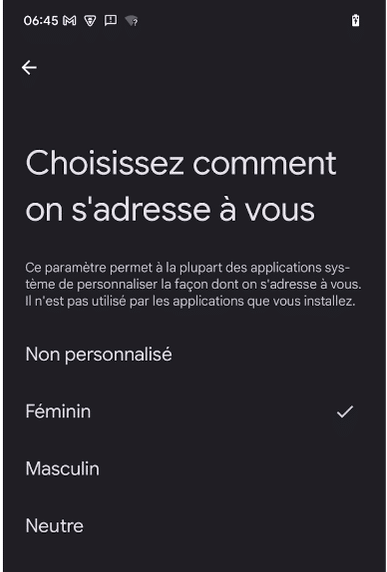 Android 15 s’adresse à vous en utilisant le genre souhaité