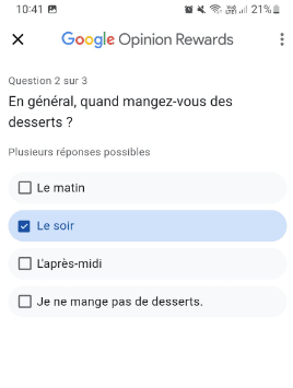 Une fois que vous aurez téléchargé l’application et que vous l’aurez associée à votre compte Google, vous serez invité à configurer votre profil en renseignant les informations suivantes : pays de résidence, code postal, tranche d’âge, sexe et langues connues. Une enquête de tutoriel non rétribuée vous sera ensuite proposée. La nôtre portait sur les desserts :
