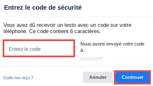 - Une fois chose faite, entrez le code reçu dans l’espace réservé puis cliquez sur Continuer.