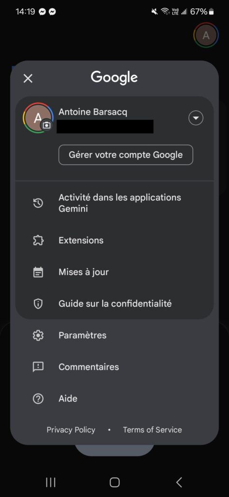 - Depuis Gemini, cliquez sur l’icône de votre compte Google, en haut à droite