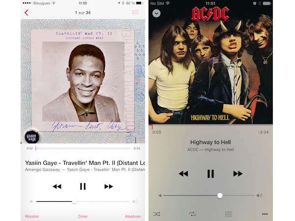 Celui dédié à la musique stockée sur l’appareil est bel et bien présent. L’accès aux filtres (artistes, albums, chansons) est par contre moins évident que précédemment, puisqu’il n’existe plus de raccourcis depuis le bas de l’interface. Autre changement lors de la lecture, l’écran de contrôle met plus en valeur la pochette de l’album et les textes inférieurs sont remplacés par des icônes.