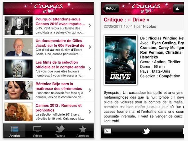 L’application Cannes en live est à l’opposé de l’application officielle du festival. Développée par les quatre amis qui sont à l’origine du blog « Cannes en live » depuis 2007, elle propose de vivre la quinzaine différemment. Son côté amateur c’est aussi ce qui fait le charme de cette application qui regroupe critiques de films, photos d’ambiance, billets d’humeur et au final de nombreuses anecdotes sur les coulisses du festival.