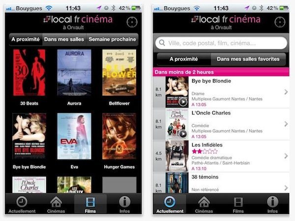 Pour les envies de ciné intempestives, il n’y a rien de mieux qu’une application pour vous indiquer la salle la plus proche. Cinéma local est cette application. Grâce au GPS du téléphone et à la géolocalisation, l’application repère les salles les plus proches, vous indique la distance qui les sépare de votre position ainsi que leur programmation. Très réactive l’appli indiqué aussi les séances en avant-première !