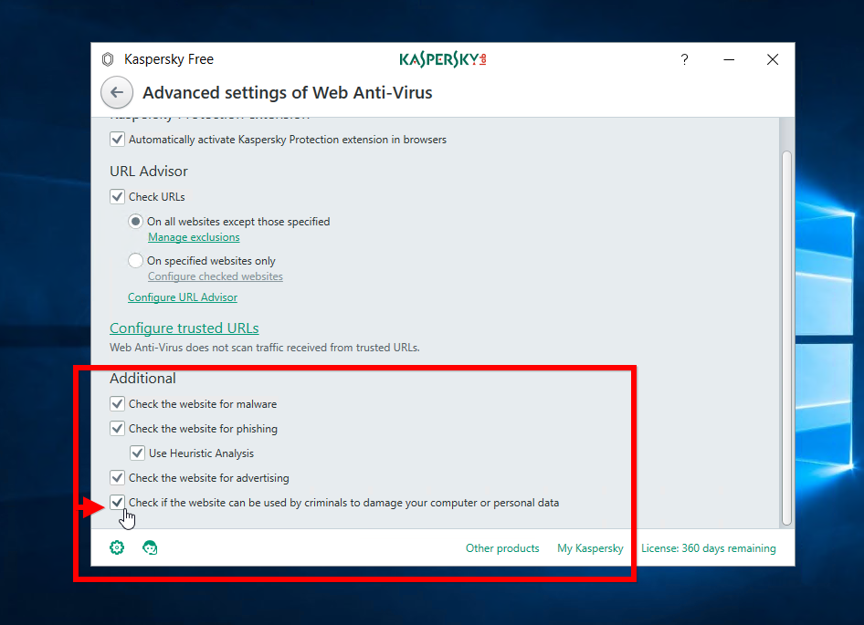 Cliquez sur l’icône Settings (en bas à gauche), ouvrez l’onglet Protection. Cliquez sur Web Anti-Virus. Et placez le curseur Security level en position High. Cliquez ensuite sur Advanced Settings. Dans la section Additional, cochez la dernière case : Check if the website can be used by criminals to damage…