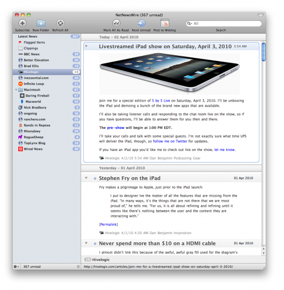 Adeptes de flux RSS, NetNewsWire regroupera tous les flux que vous suivez. L’un de ses principaux avantages est d’être synchronisable avec Google Reader qui centralise ainsi tous vos RSS lus et non lus. Une synchronisation est également possible avec Instapaper ou Delicious. Enfin, sa compatibilité avec MarsEdit propose de poster directement des articles sur un blog.