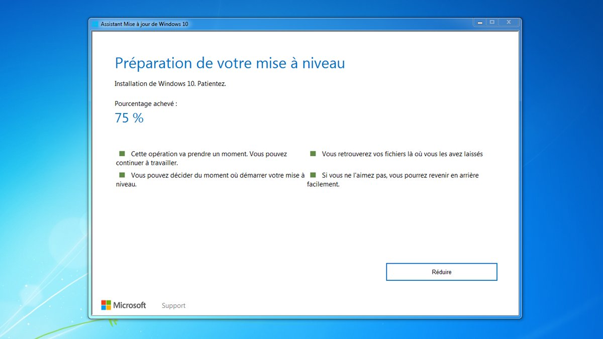 Vous pouvez également continuer à travailler comme si de rien n’était en cliquant sur le bouton Réduire. Le processus ne s’interrompra pas et vous pouvez vaquer à vos occupations sous Windows 7, le temps que le logiciel télécharge et prépare l’installation de Windows 10. L’opération dure une vingtaine de minutes environ.