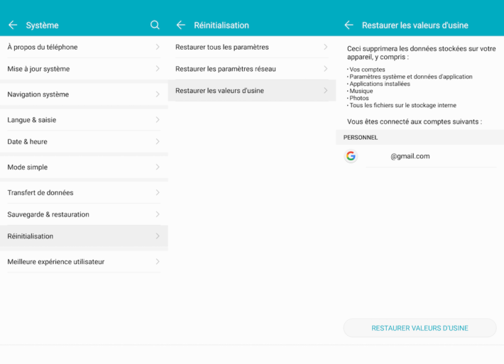 Il existe deux méthodes pour rétablir les réglages d’usine. Dans le cas où votre téléphone finit par s’allumer et fonctionner normalement, vous pouvez simplement vous rendre dans les paramètres d’Android. Cliquez l’onglet « Système » en bas de la page, puis sur « Réinitialisation ». Enfin, choisissez « Restaurer les valeurs d’usine » et laissez faire votre smartphone. Notez que selon le modèle de votre téléphone et votre version d’Android, les intitulés peuvent changer. Ainsi, les menus pourraient également porter les noms « Sauvegarde et réinitialisation » puis « Rétablir la configuration d’usine ». Dans tous les cas, ces menus ont le même effet.