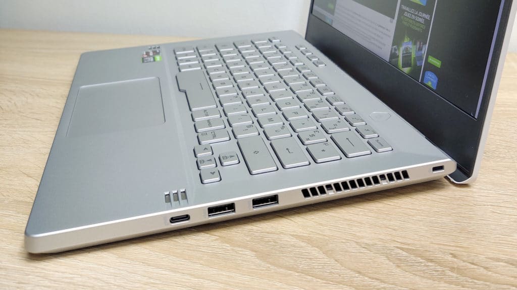 L’un des deux ports USB Type-C (celui de gauche) peut également servir pour recharger jusqu’à 65W le Zephyrus G14, bien qu’un connecteur d’alimentation classique soit aussi présent afin d’y brancher le transformateur de 180W. Attention toutefois : cette alimentation externe de 180W est indispensable pour pouvoir jouer dans de bonnes conditions pendant la recharge, le chargement via le port USB ne pouvant délivrer une puissance suffisante pour jouer en même temps.