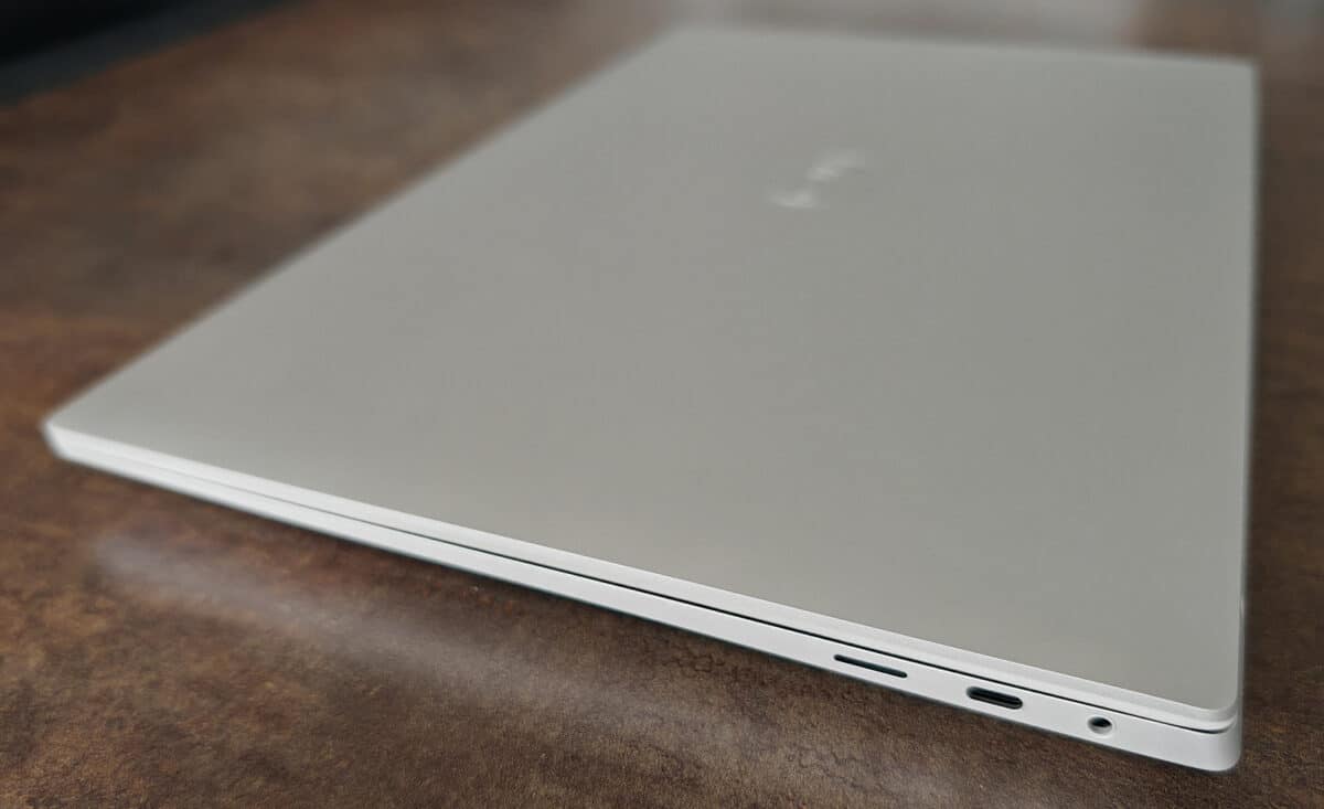 Comme ses prédécesseurs au format 13, 15 ou 17 pouces, le XPS 16 est entièrement réalisé en aluminium. Cela lui confère une résistance certaine et une certaine légèreté. Ainsi, son poids n’est que de 2,2 kg. C’est tout de même 300 grammes de plus que d’autres configuration au format 16 pouces, comme l’Acer Swift X 16 OLED ou le Samsung Galaxy Book4 Ultra, dont nous avons publié les tests récemment.