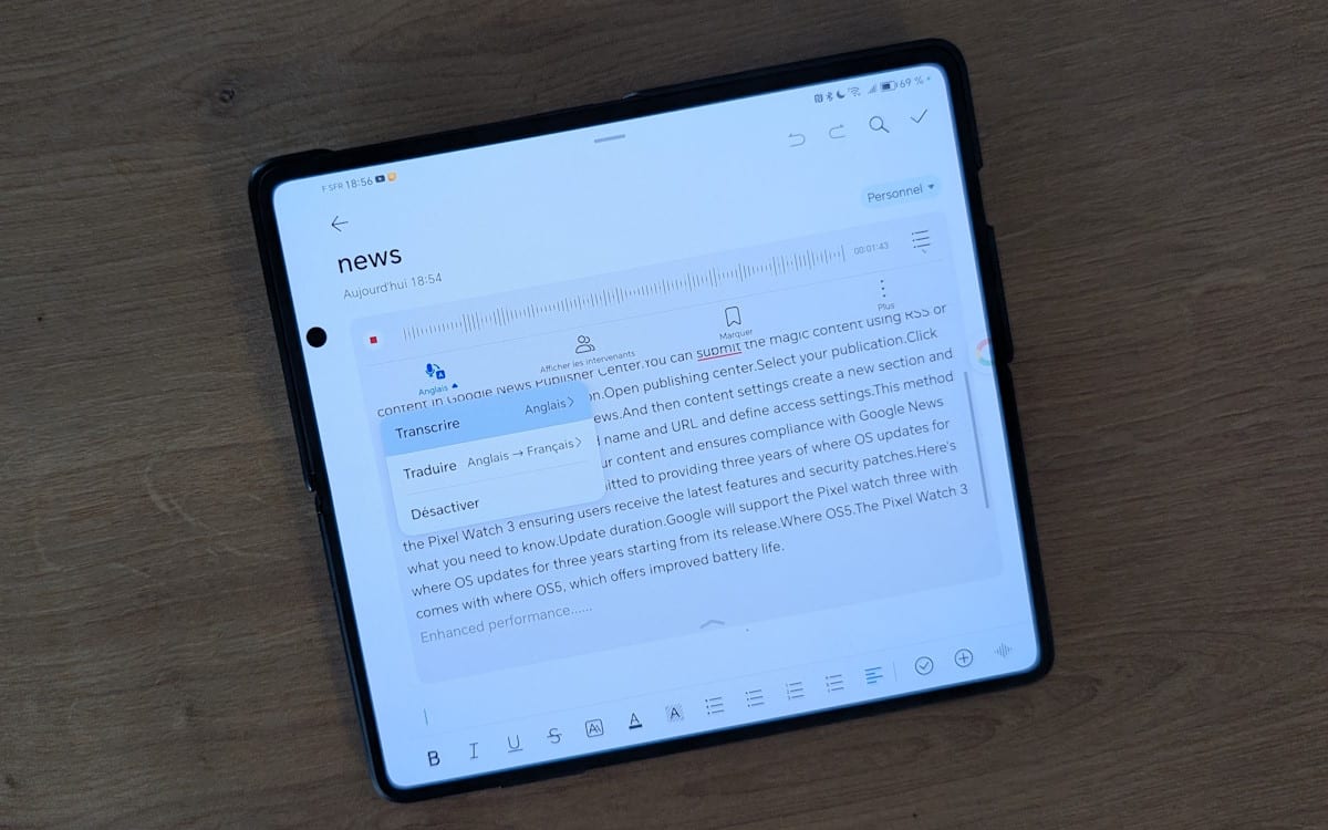 Autre nouveauté, la traduction face à face, s’avère très efficace avec une traduction instantanée des propos de deux interlocuteurs parlant des langues différentes. Dans le même esprit, l’application Notes inclut la possibilité de lancer un enregistrement vocal avec la retranscription immédiate à l’écran d’un discours ou même sa traduction dans une autre langue. L’ensemble peut bien sûr être sauvegardé. Le partenariat avec Google Cloud annoncé en mai dernier par Honor a manifestement porté ses fruits. Le Magic V3 profite des fonctions IA de Google, réadaptées par la marque chinoise.