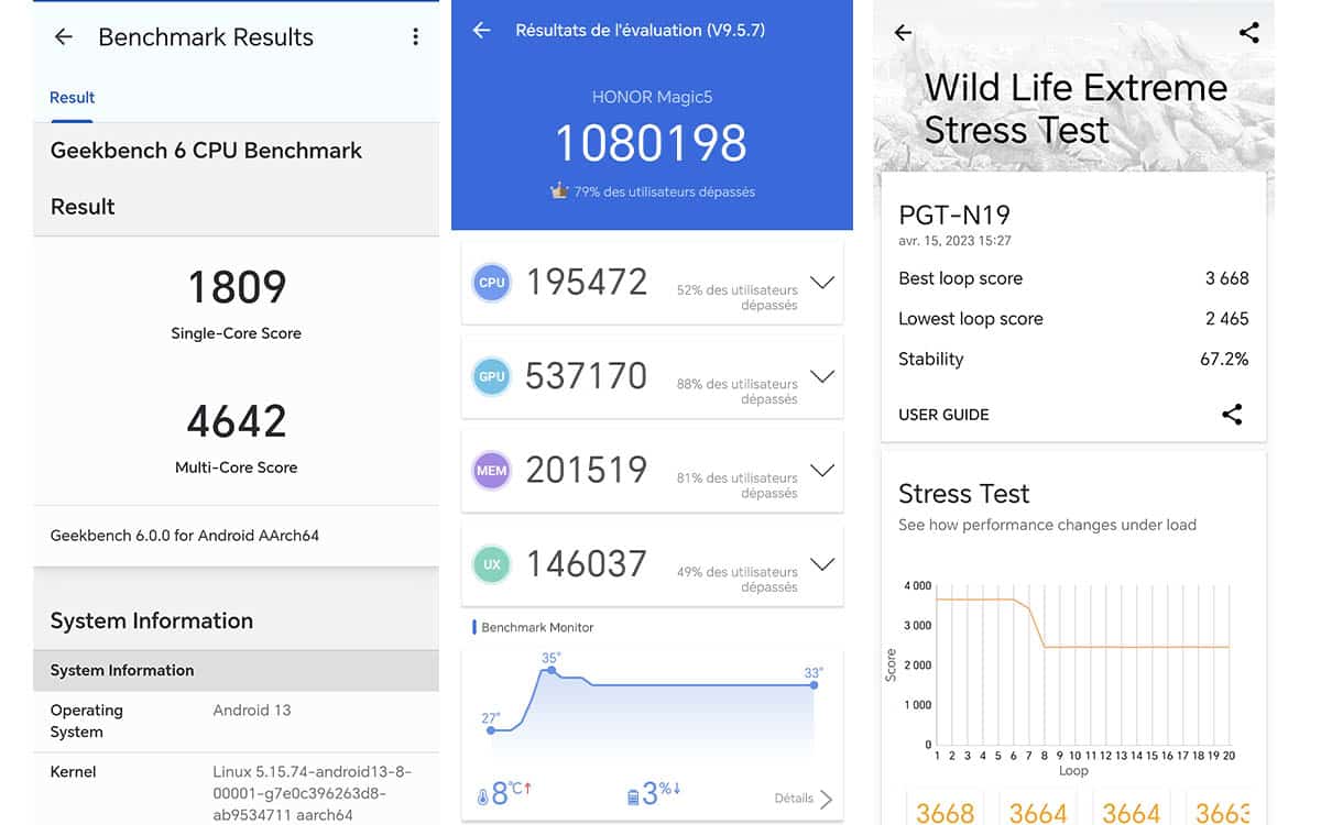 Comme une bonne partie des smartphones haut de gamme de ce début d’année, le Magic5 Pro est équipé du processeur Snapdragon 8 Gen 2, un monstre de puissance, relativement économe en énergie, ce qui ne gâche rien. Le smartphone est capable de faire tourner tout type d’applications sans peine, jeux gourmands en ressources inclus, à l’instar de ses concurrents directs. La montée en température reste très maîtrisée lorsque le smartphone est poussé dans ses retranchements : le boîtier n’est pas monté à plus de 43 degrés avec une sensation de chauffe sous les doigts très raisonnable. La stabilité s’est révélée correcte lors de nos tests, malgré une brusque chute de performances visible dans certains tests au bout de quelques minutes. Sans doute pour préserver la batterie.