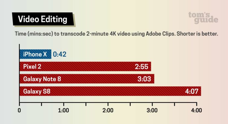 Par exemple, l’iPhone X n’a pris que 42 secondes pour transcoder une vidéo 4K de deux minutes en utilisant l’application Adobe Clips. Même résultat pour l’iPhone 8 Plus alors que la même opération sur le Pixel 2 a demandé 2 minutes et 55 secondes, 3 minutes et trois secondes sur le Galaxy Note 8 et 4 minutes et 7 secondes sur le Galaxy S8.