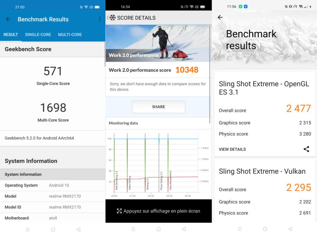 La différence entre les deux puces est plus sensible en 3D, par exemple en utilisant l’appli 3D Mark. Les indices de performance du realme 7 Pro sont alors de 2477 (Sling Shot Extreme – openGL) et de 2295 (Sling Shot Extreme – Vulkan), contre 3289 / 3079 pour le Snapdragon 765G, qui s’avère donc 33% plus véloce en 3D. Le GPU Adreno 618 du Snapdragon 720G est donc légèrement moins performant que l’Adreno 620 du Snapdragon 765G.