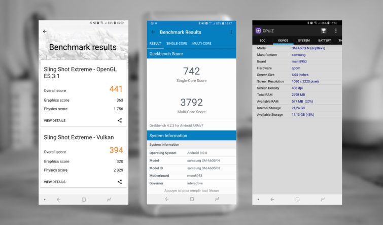 Afin d’évaluer les performances du Galaxy A6+ par rapport à ses principaux concurrents, nous l’avons soumis à deux tests de benchmarks : Geekbench 4 et 3DMark. Le premier test permet de mesurer la puissance de calcul, tandis que le second s’attarde sur les performances 3D en jeux. Nous avons décidé de comparer le smartphone au Honor 7C, avec les mêmes caractéristiques, mais vendu 200 euros moins cher, le Moto G6, lui aussi équipé du Snapdragon 450, ainsi que le Honor 10 et l’Asus Zenfone 5, vendus une trentaine d’euros de plus que le smartphone de Samsung.
