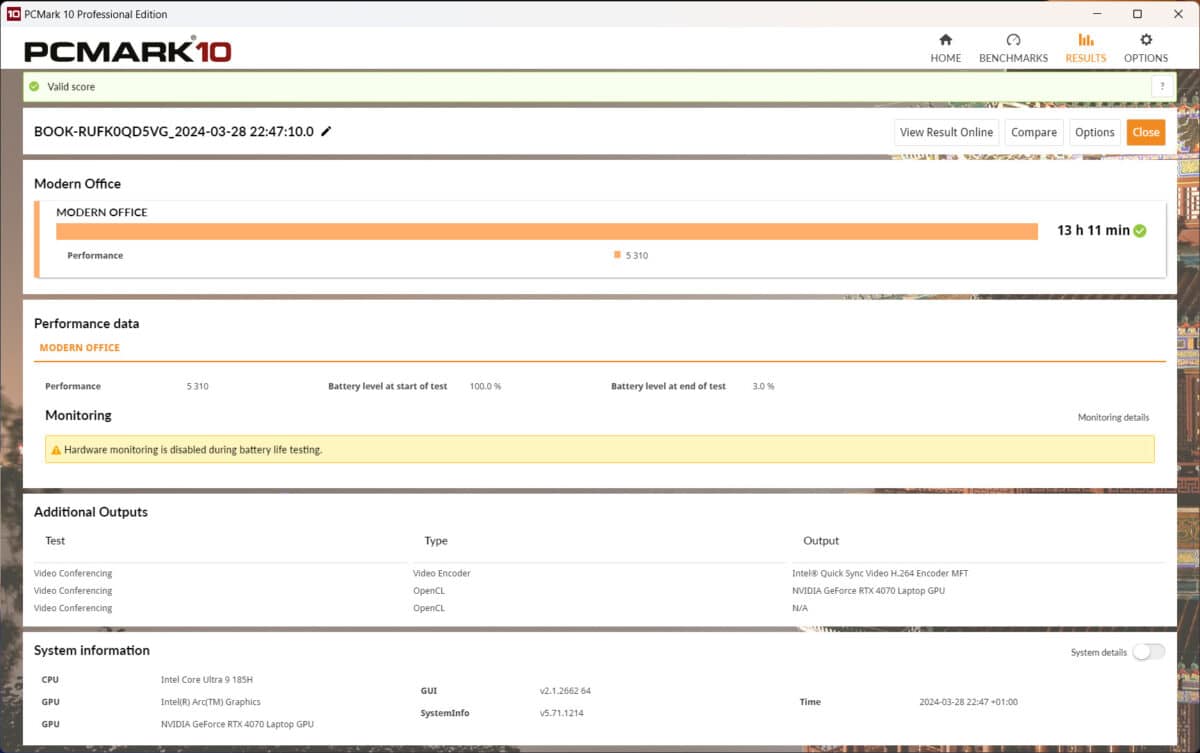 Par exemple, dans ces conditions, avec le test d’autonomie Modern Office de l’application PC Mark, le Galaxy Book4 Ultra a fonctionné pendant 13 heures et 11 minutes. Cet excellent résultat n’est que très légèrement moins bon que celui observé sur l’Asus Zenbook 14 OLED (UX3405), équipé de la puce Intel Core Ultra 7 155H et dénué de GPU (seulement l’iGPU Intel ARC). En effet, ce dernier avait fonctionné pendant 13 heures et 37 minutes.