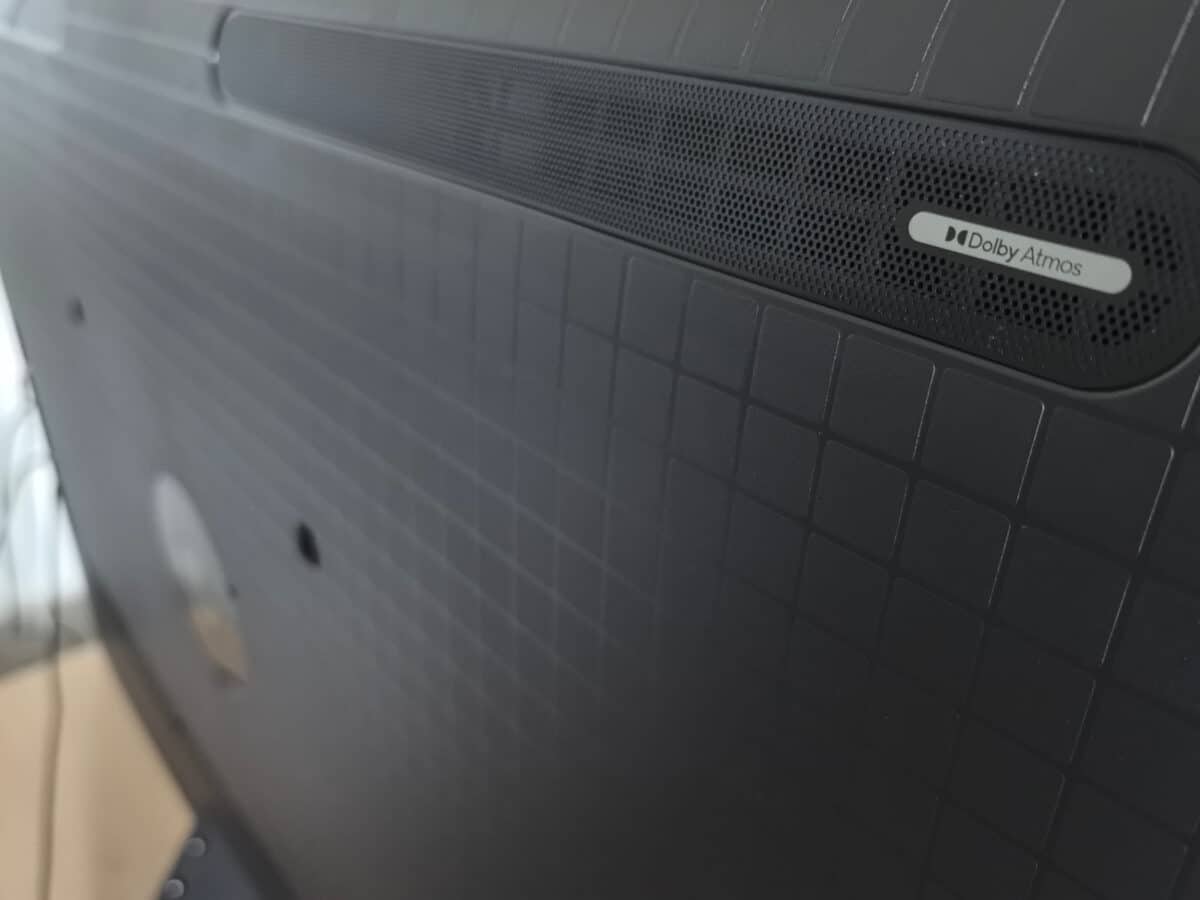 La série C89B de TCL embarque un équipement audio de type Dolby Atmos. En l’occurrence, le son est censé être restitué en 2.1.2 sur le modèle 65 pouces que nous avons testé. On doit donc bénéficier d’une restitution stéréo, avec un subwoofer (au dos de l’écran) et deux haut-parleurs complémentaires, orientés le plafond, afin de restituer les effets audio verticaux de la technologie Dolby Atmos.