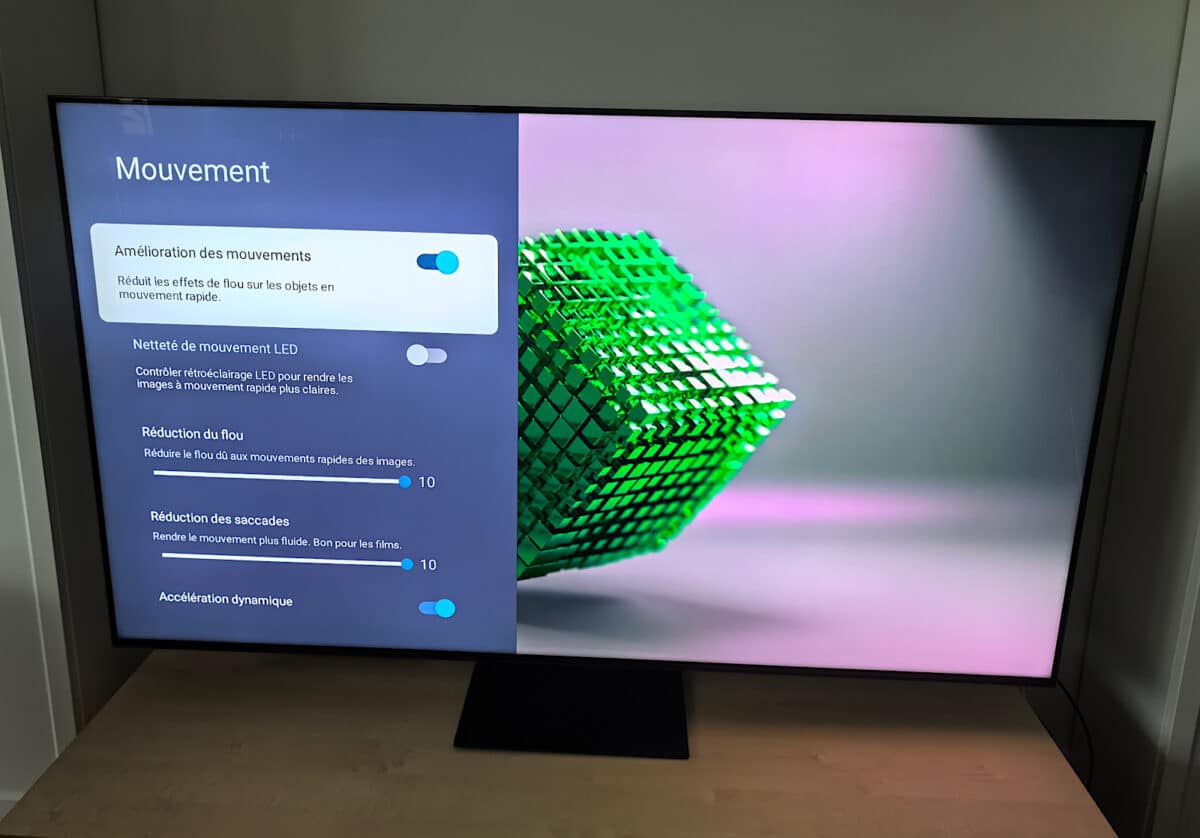 De son côté, le nouveau processeur AiPQ Pro exécute de belles mises à l’échelle 4K des contenus en définition inférieures, Full HD par exemple. Il se charge également de réduire au maximum les défauts d’affichage pouvant être visibles autour des objets qui se déplacent à l’image. Diverses options présentes dans le section Mouvement, permettent de minimiser ces artefacts visuels, assez désagréables, encore présents, parfois.