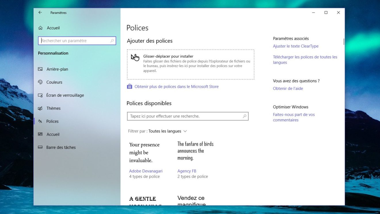 Comment y accéder : depuis le bouton Démarrer et en cliquant sur Paramètres > Personnalisation > Polices.