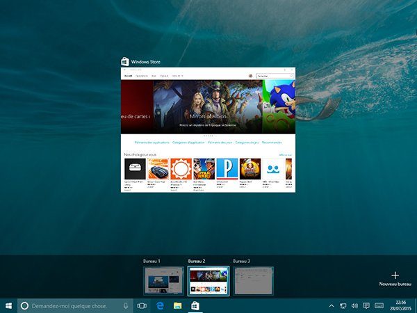 Cette fonctionnalité, les utilisateurs de Linux et de Mac OS X la connaissent bien. Les bureaux virtuels permettent de dédier un espace à chaque type d’application. Vous pouvez par exemple consacrer un bureau à votre navigation, un autre à votre messagerie ou vos réseaux sociaux, un troisième à la retouche photo, etc. Une fonction très utile lorsque l’on a qu’un écran ou tout simplement lorsqu’on souhaite ordonner correctement son environnement de travail. Ce genre de fonctionnalité est déjà possible sous Windows, mais il faut impérativement passer par un logiciel tiers comme Dexpot, Blacksmith, Moo0 MultiDesktop, etc. Mais avec Windows 10, plus besoin d’installer ce genre de programme, puisque l’OS peut intégrer nativement un système de bureaux virtuels.