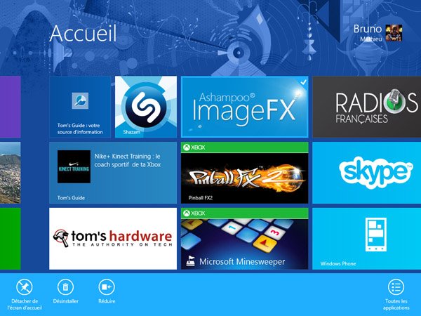 Une fois l’écran de verrouillage passé, vous accédez à l’Interface Windows. Cet environnement peut se contrôler de différentes façons : soit au doigt si vous possédez un écran tactile, soit à l’aide de la souris, soit via les touches du clavier. Peu importe la configuration employée, gardez en tête que l’interface se contrôle à l’horizontale, et non à la verticale comme c’était jusqu’à présent le cas avec les fenêtres de Windows. En clair, vous devrez souvent balayer l’écran de la gauche vers la droite pour afficher l’intégralité du contenu.