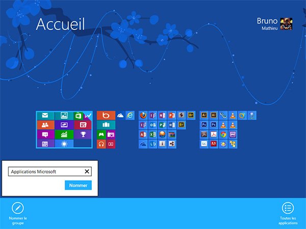 Lorsque l’on installe un grand nombre d’applications, l’Interface Windows se retrouve rapidement remplie de tuiles… Difficile de s’y retrouver dans de telles conditions. Il reste donc préférable de créer des « groupes » de tuiles et de les renommer. Commencez par ordonner vos tuiles, puis activer la vue panoramique : soit à l’aide de vos deux doigts sur un écran tactile, soit en pointant votre curseur en bas tout en bas à droite de l’écran. Cliquez sur ensemble de tuiles à l’aide du bouton droit : vous pouvez dès lors attribuer un nom à chaque groupe de tuiles.