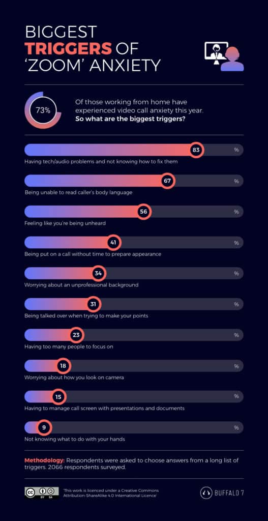 Buffalo 7 a interrogé 2 066 travailleurs à domicile au Royaume-Uni. L’agence a découvert que 83% des sondés ont déclaré qu’avoir des problèmes techniques et de ne pas savoir comment les résoudre était leur plus grand déclencheur d’anxiété sur Zoom.